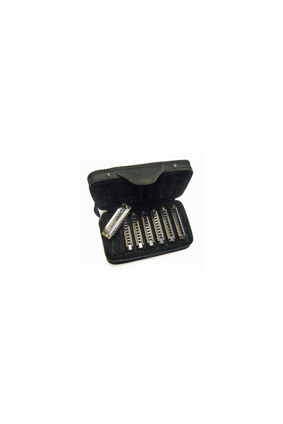 Kit di 7 armoniche diatoniche Blues Band con borsa rigida con maniglia per il trasporto.