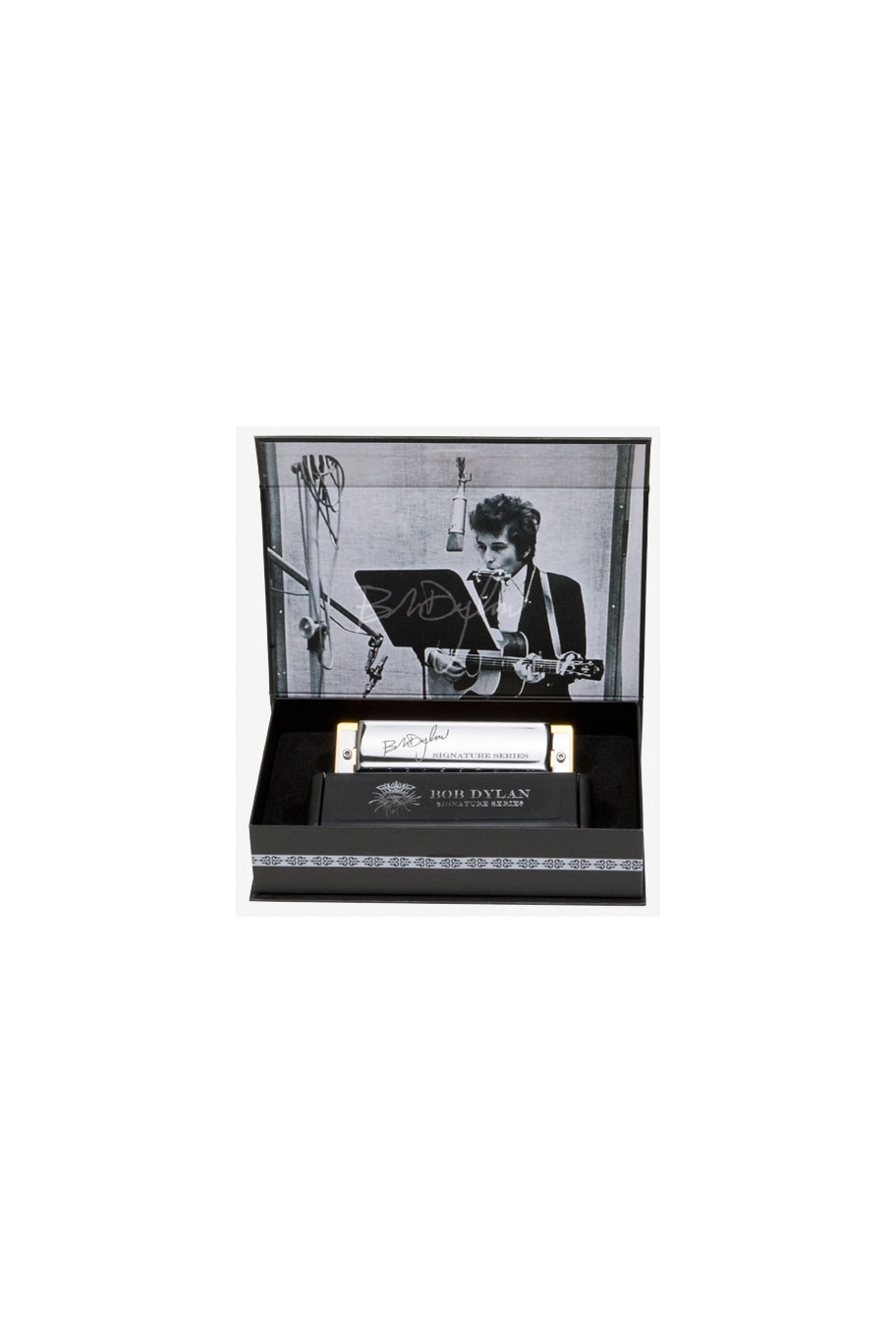 Modello Signature Bob Dylan, derivato dal modello Marine Band Classic con ance placcate oro e coperture in acciaio con incisioni esclusive.