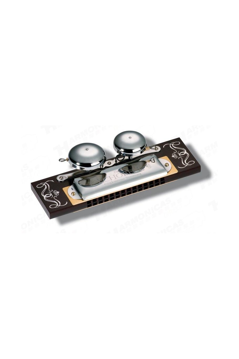Hohner Echobell, 28 reeds, 0,9 mm brass reed plate, comb made of wood, length approx. 17 cm. Continuing with thomann the very successful "Historic Collection" line, we proudly present the new "Echobell" harmonica. In the twenties Hohner offered special tremolo harmonicas with attractive bell assemblies. With its two different bells, you can provide your playing with a beautiful rhythm element.