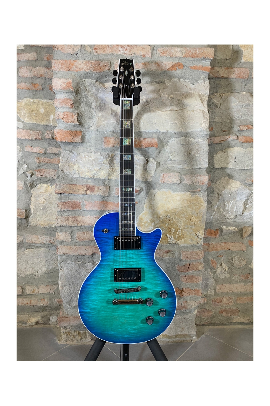 This guitar features a solid, one-piece genuine mahogany body and a figured curly maple veneer wrapped in a Neptune Blueburst finish. Its unique appearance is enhanced by abalone and mother of pearl inlays on the fretboard and head veneer.