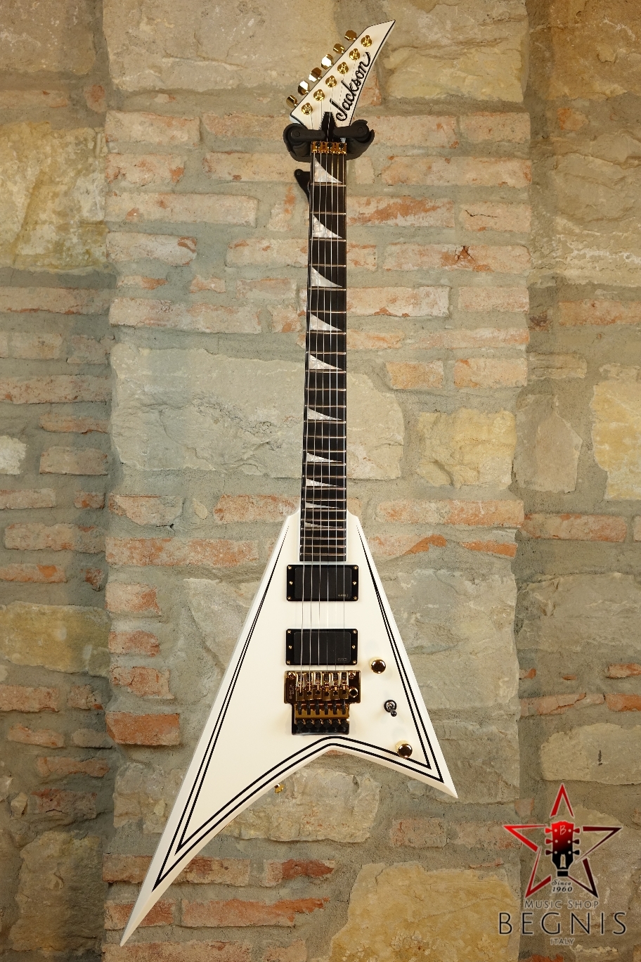 Disponibile in Gloss Black con pinstripe gialli o Snow White con pinstripe neri, e con paletta a punta Jackson in tinta e 6 meccaniche in linea e hardware dorato.