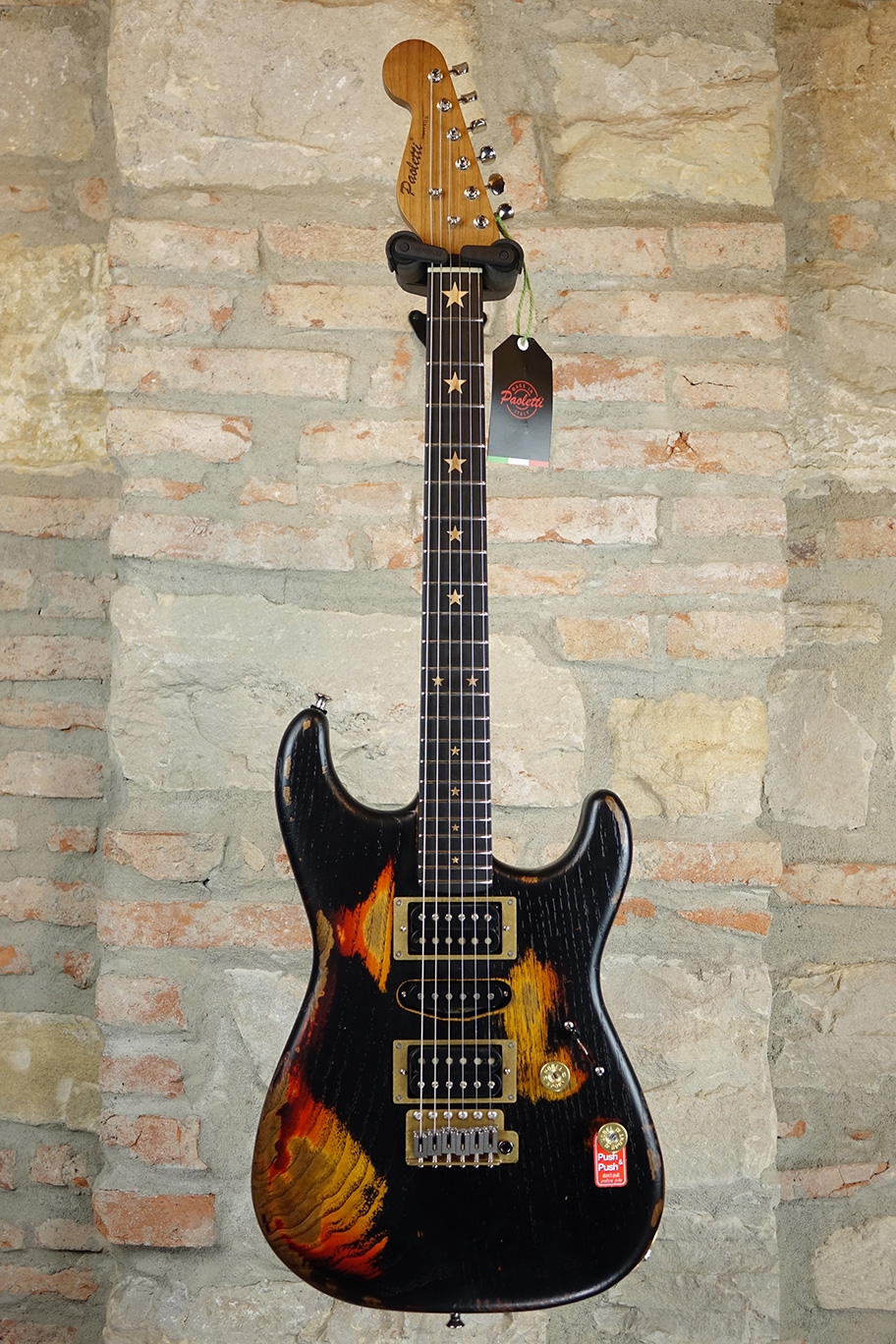 PAOLETTI Stratospheric Loft Pickled HSH - Ebony FB w/Olive Star - Heavy Black over 3T Sunburst - FlameTone pickups