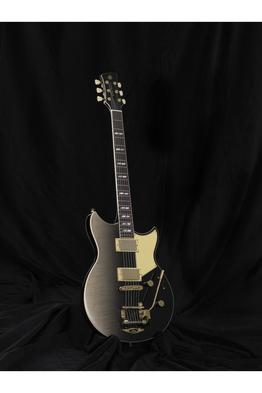 Celebrating six decades of excellence, this 60th Anniversary model showcases a flame maple top in a refined Noble Black finish, blending luxurious aesthetics with unique character. Featuring a Goldo tremolo unit and Gotoh locking tuners, it delivers dynamic range and expressive tones with smooth playability. The bone nut further enhances the guitar's natural and balanced resonance. This guitar features a chambered body and carbon reinforcement developed with Yamaha exclusive Acoustic Design process to sculpt tone, reduce weight, and ensure optimal balance. Dual humbucking pickups, combined with a 5-position pickup selector and a passive push/pull Focus Switch, provide unique versatility for a dual-pickup guitar.