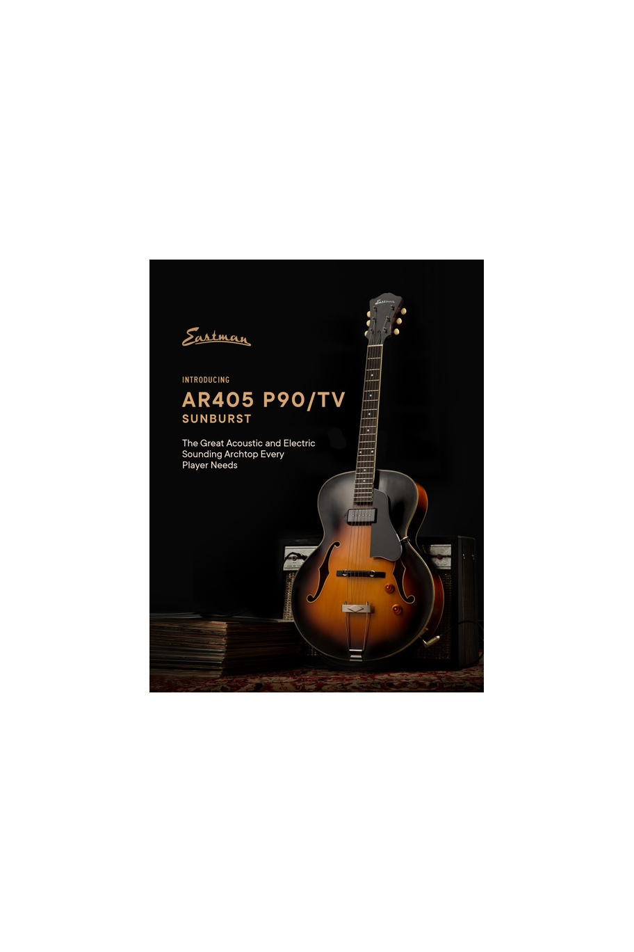 The Eastman AR405 P90/TV fully-hollow electric guitar, now available in gorgeous Sunburst, captures the essence of vintage jazz tone. It's maple laminate body with Truetone Vintage Gloss finish and rosewood fingerboard deliver warmth and clarity, while the Tonerider Dog Ear P-90 adds classic bite. Finished with a rosewood floating bridge and nickel trapeze tailpiece, it's elegant, resonant, and stage-ready.