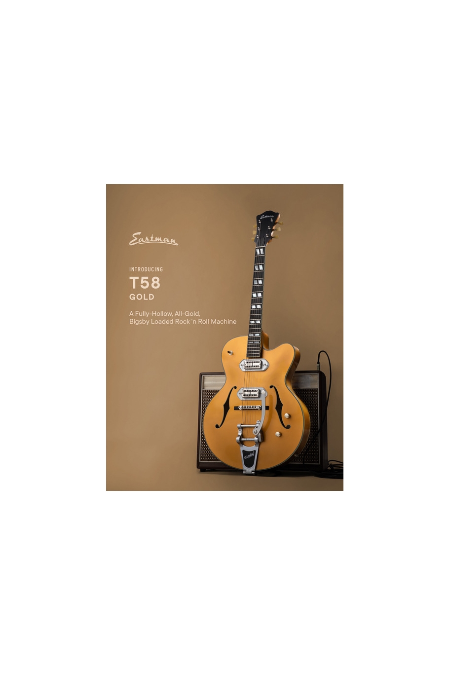 The Eastman T58 fully-hollow electric guitar is now in a stunning Truetone Gloss Gold finish, blending vintage style with modern playability. With a spruce top, maple back/sides, and ebony fingerboard. It delivers a resonant tone with exceptional clarity. A Goldo Bridge, Bigsby tailpiece, and Tonerider Vtron pickups provide smooth playability, making the T58 Gold both elegant and performance-ready.