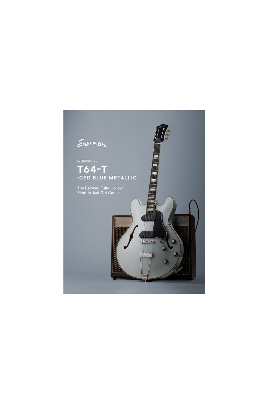 The Eastman T64-T fully-hollow electric guitar, now in cool Iced Blue Metallic, blends vintage style with modern precision. Featuring a maple laminate body, ebony fingerboard, and Truetone Gloss finish, it offers rich resonance and smooth playability. Equipped with Tonerider Dog Ear P-90 pickups, Gotoh bridge, and nickel trapeze tailpiece, the T64-T delivers classic tone and effortless expression.