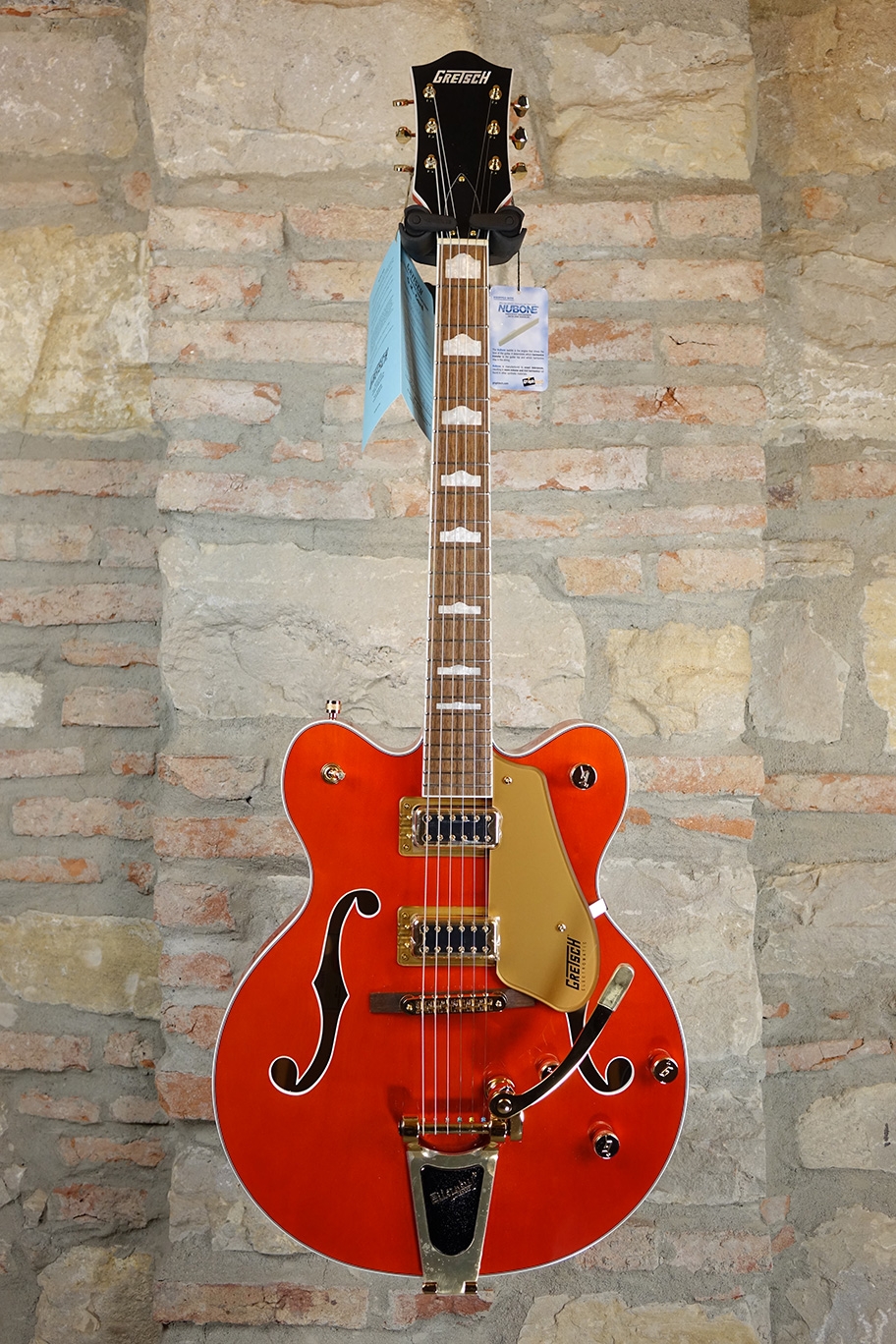 The G5422TG Electromatic® Classic Hollow Body Double-Cut with Bigsby® and Gold Hardware features a laminated maple body with vintage-inspired perimeters and refined arches, as well as all-new trestle block bracing to help reduce unwanted feedback. By increasing rigidity and contact between the top and back of the body, the new trestle block design also results in the sound having a faster attack with more focus, snap, and increased sustain. Coupled with all-new FT-5E Filter’Tron™ pickups, this hollow build’s voice explodes with huge full-bodied punch, classic chime and enhanced presence, clarity and note definition.