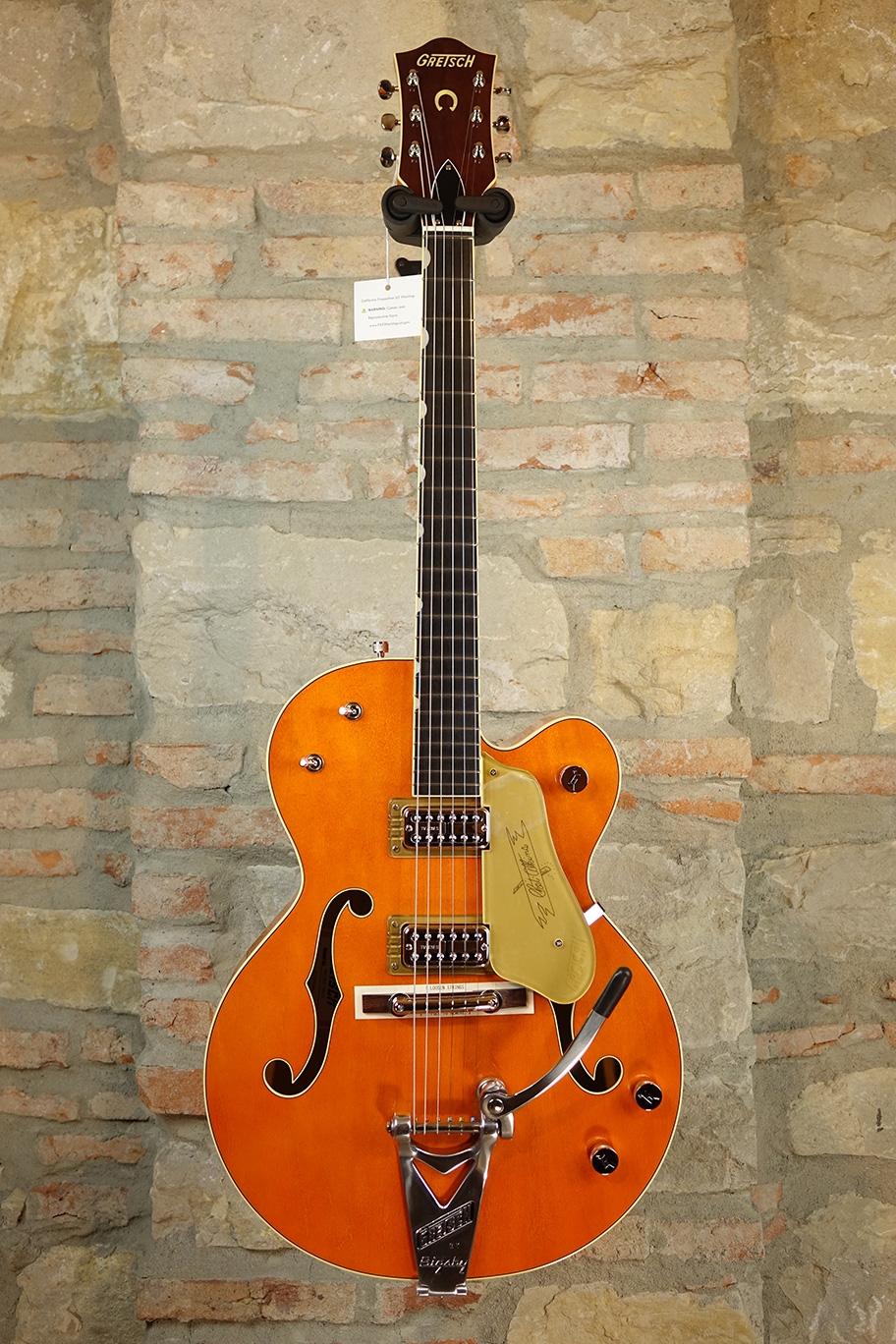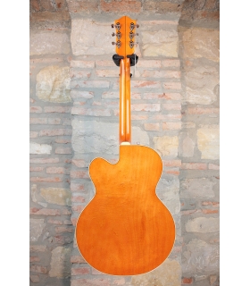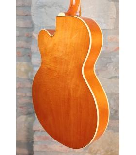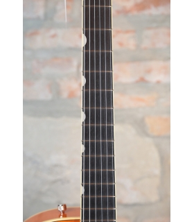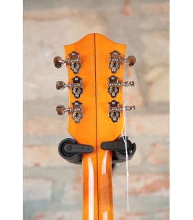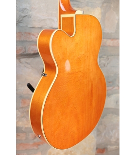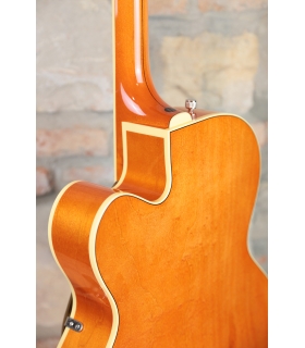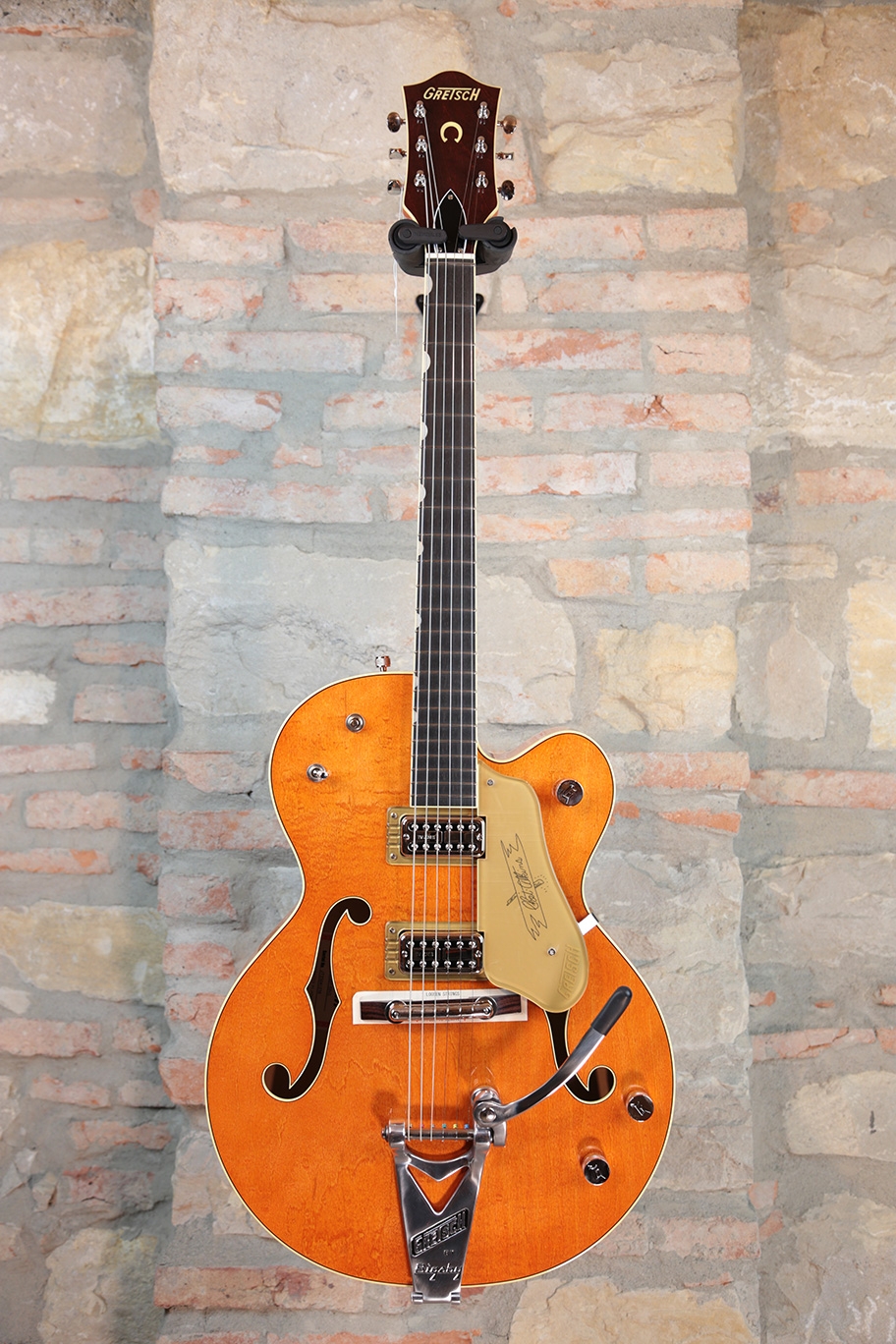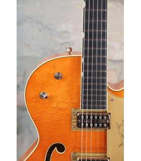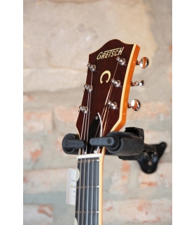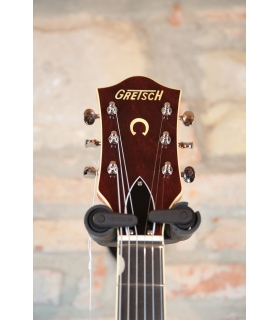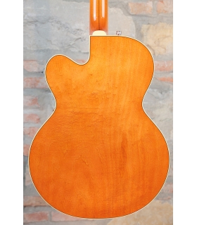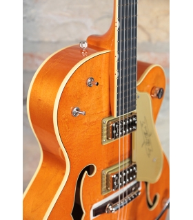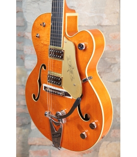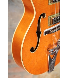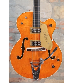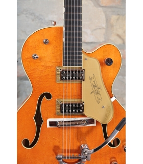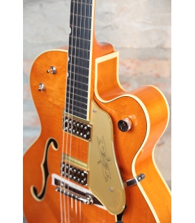 Designed for pure tone and slick, comfortable playing feel, this guitar features the classic aesthetics true Gretsch fans love—nickel G-arrow control knobs, aged white binding with black purfling, durable gloss nitrocellulose lacquer finish, aged pearloid thumbnail inlays, gold vintage thick plexi pickguard with Gretsch logo and nickel Grover® Sta-Tite™ tuning machines. Elegant style and refined sound combine to make the G6120T-59 Vintage Select Edition '59 Chet Atkins® Hollow Body with Bigsby® a Gretsch aficionado’s dream guitar.