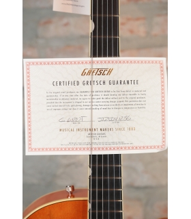 A pair of the ever popular TV Jones® Classic pickups creates high-quality tone with plenty of dynamics and articulation on tap. Traditional Gretsch controls, including dedicated volume controls for both the neck and bridge pickups, master volume and the classic three-position tone switch, allow you to blend and shape the pickups’ sound, creating countless tonal variations. The new Gretsch “Squeezebox” capacitors provide an incredibly silky high end. The vintage “V”-shaped maple neck bears a 12”-radius ebony fingerboard with 22 frets for a classic playing experience that works with all musical styles. 1959 trestle bracing connects the top and back of this guitar for authentic, snappy vintage tone. A pinned “rocking” bar bridge reacts in tandem with the Bigsby B6CVT vibrato tailpiece for stable tuning while the vintage-style genuine bone nut lets the strings slide freely without binding in the slots.