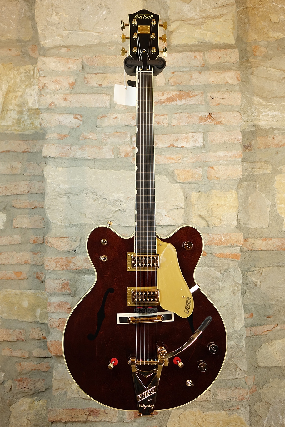A true rock ‘n’ roll classic, this guitar features the appointments that made this guitar a legend—dual foam string mutes with red felt surrounds, standby switch, laminated 3-ply maple top, gold G-arrow control knobs, aged white binding with black purfling, gloss urethane finish, aged pearloid thumbnail inlays, gold vintage thick plexi pickguard with Gretsch logo and gold Grover® Imperial™ tuning machines. A distinguished instrument from the earliest days of the British Invasion, the G6122T-62 Vintage Select Edition '62 Chet Atkins® Country Gentleman® Hollow Body with Bigsby® is the guitar that laid down the foundation of rock as we know it.