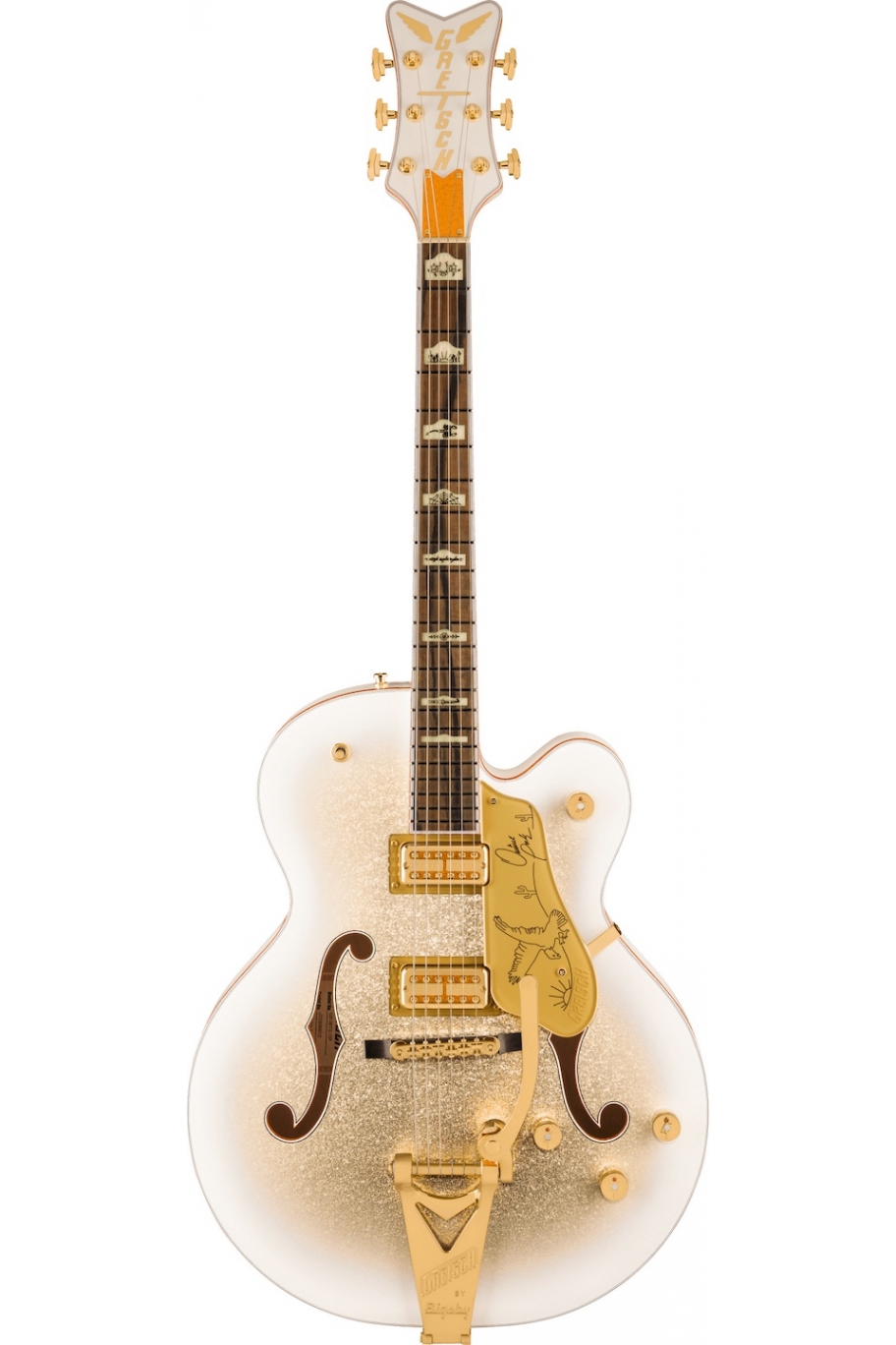 The G6136TG-OP features exclusive western-themed artwork by Judith Rothman Pierce of RoseCut Clothing on the gold plexi pickguard and aged pearloid Humpblock fingerboard inlays, adding a distinctive style and vibe that manages to be both fresh and classic at the same time.