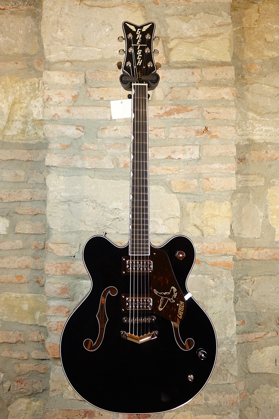 A player-centric instrument ready to rock any genre, the G6636-RF Richard Fortus Signature Falcon Center Block with V-Stoptail comes in a striking Black finish and is decked out with nickel hardware including the jeweled G-arrow knobs, pearloid Neo-Classic™ thumbnail inlays and headstock logo and tortoise pickguard, pickup bezels and binding.