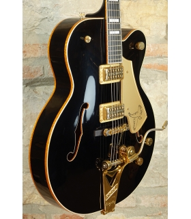 For big sound in a small package, the G6659TG Players Edition Broadkaster® Jr. Center Block with Bigsby® and Gold Hardware features a slightly smaller single-cutaway body for greater comfort, tonal focus and feedback resistance, all with a matching headstock and gleaming gold hardware. Two new U.S.-made Full'Tron™ pickups deliver full-spectrum sonic range with a growl unlike any other pickup, in addition to classic Gretsch chime, balance and brilliance with a dash of extra-mid concentration for powering through overdriven and distorted passages at full volume.