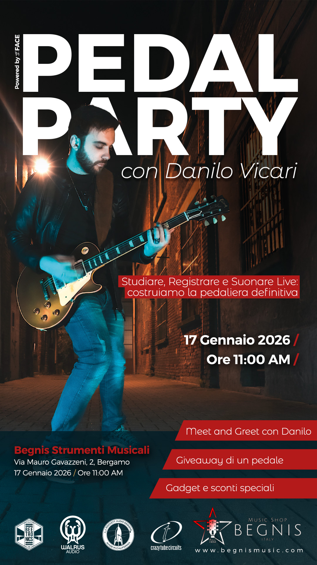 Clinic di Danilo Vicari, content creator e chitarrista di riferimento per la community di chitarristi in Italia e non solo, seguito da oltre mezzo milione di persone su YouTube e Instagram. Esperto di effetti e suoni, con centinaia di recensioni e contenuti sui suoi canali, ci porterà nel mondo dei pedali, come ottenere suoni pro e realizzare una pedaliera, dallo studio fino al live.