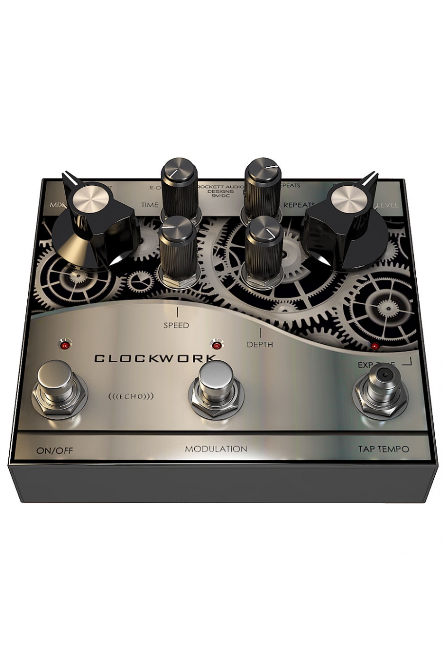 The Clockwork Echo recreates the old school magic but with modern functionality. Classic BBD delay chips that are digitally controlled for tap tempo only. True stereo output, with one side out of phase. Two Expression pedal inputs to control Time and Repeats. Foot switchable modulation with speed and depth. “Always On” boost which can be used whether the delay is engaged or not. Experimenting with the modulation controls will get you chorus, rotating speaker and flange sounds.