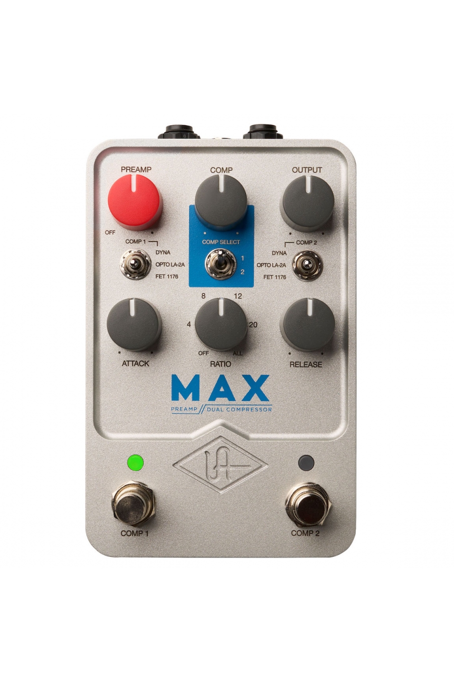 UAFX Max Preamp & Dual Compressor prevede un doppio compressore stereo con tre effetti iconici per chitarra, preamplificatore valvolare UA 610 ed EQ, footswitch custom e filtro per basso sidechain, il tutto controllabile tramite l'app UAFX Control. Realizzato sulla base della pluripremiata serie UAFX con elaborazine "dual-engine", Max Preamp & Dual Compressor integra in un unico pedale tre leggendari limiter e un iconico pre valvolare. Con questo pedale è possibile sperimentare la perfetta compressione dell'UA 1176, sviluppato direttamente dal fondatore di Universal Audio Bill Putnam. Max offre lo stesso compressore FET utilizzato per decenni per definire leggendari suoni di chitarra in studio, così come la compressione valvolare del Teletronix LA-2A, iconico limiter ottico a valvole che offre un controllo della dinamica più morbido e caldo rispetto al modello 1176.