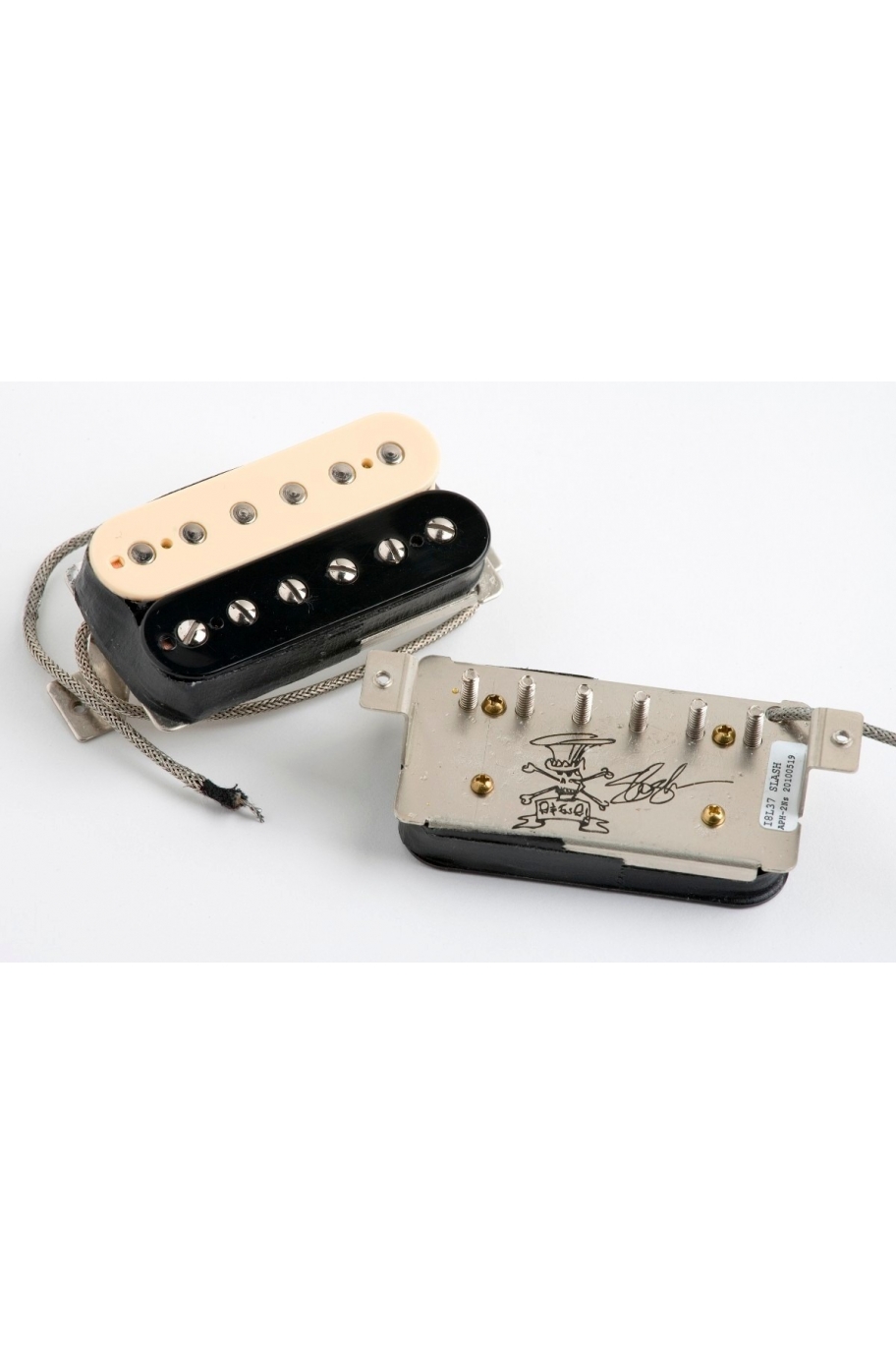 When Slash was given the honor of having a Gibson Les Paul Signature model built, we sent over the same Alnico 2 Pro humbuckers that he has used for decades. Turns out, the new guitars sounded noticeably different than the original. So we accepted the challenge to make him a new pickup that would make all of his new signature guitars sound just like the original AFD Les Paul. The result is the Slash Signature Model humbucker. We used a different mag wire and winding spec, that, when combined with the alnico 2 bar magnet, provided exactly what was needed to push a stock Les Paul toward that familiar sustain, crunch, and midrange that was so characteristic of the tone of Slash’s original Derrig Les Paul copy.The Slash humbucker set is hand built in Santa Barbara the same way we built his originals in the 80s, using a nickel silver bottom plate with long mounting legs, single conductor braided lead wire, maple spacer, paper tape, and wax potting.