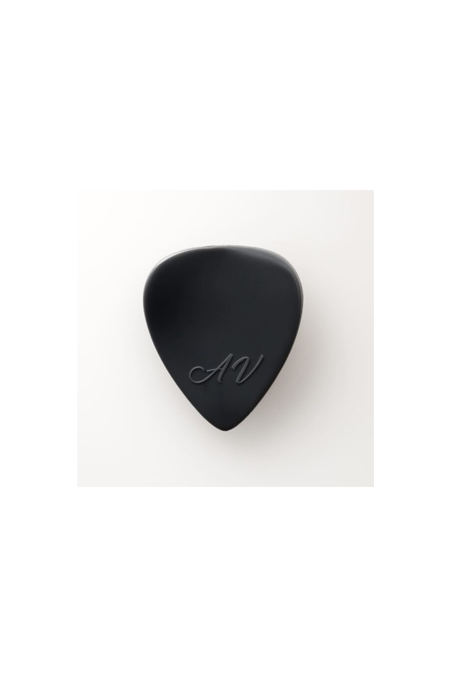 Il pollice, infatti, è il dito che dosa la sensibilità della presa: scorre lungo il plettro, generando posizioni diverse di plettrata e differenti approcci al contatto con la corda. Ma è l’indice la controparte decisiva che fornisce l’appoggio necessario: è la vera colonna della presa sul plettro, il pilastro su cui si regge il lavoro del pollice. Per questo, la peculiarità dell’AV è una presa assolutamente particolare: è un plettro direzionale con un lato riservato esclusivamente alla presa dell’indice (quello della scritta “Plick”) e l’altro alla presa del pollice (quello della scritta “AV”).