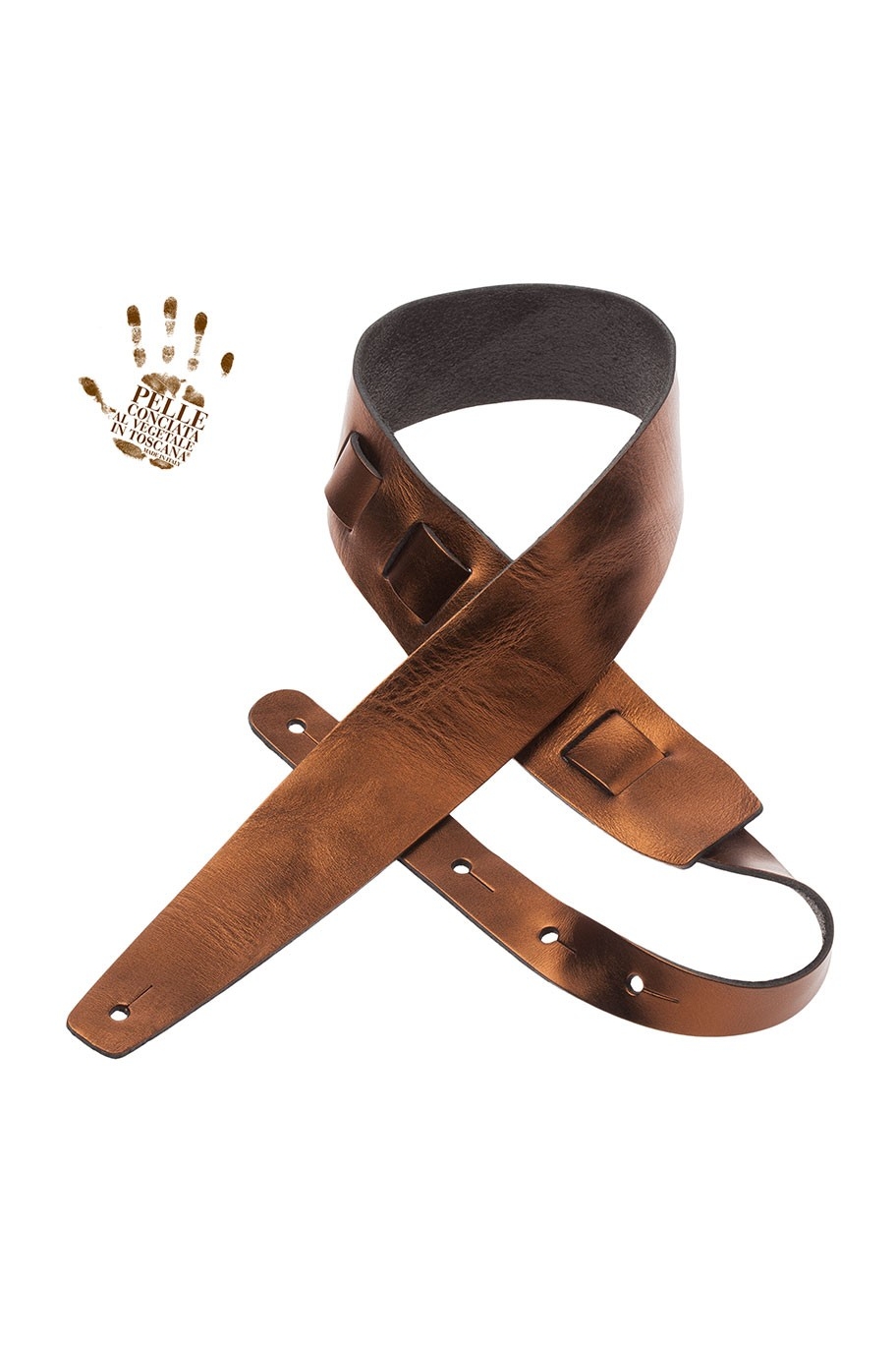 Le tracolle per chitarra e basso Magrabò Holes HC Metallic vengono ricavate da un unico pezzo di Vera Pelle Certificata dal Consorzio Pelle Conciata al Vegetale in Toscana con una finitura metallizzata molto resistente e senza cuciture.